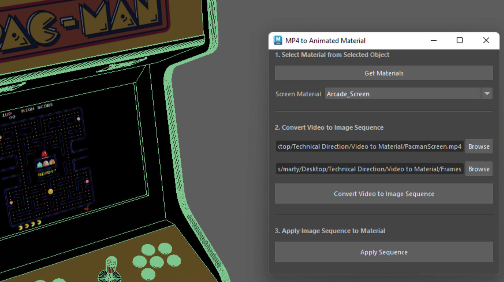 To add nostalgic appeal, I wanted to have animated screens of retro video games that would play during the fly-through of the environment. Converting video files into an image sequence requires an external application to Maya, and applying that to a material is non-intuitive. I created this tool to automate this process.